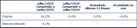 Na comparação com o mesmo mês do ano passado, a queda foi mais intensa, chegando a 6,4%. No acumulado de 2025, o índice já registra retração de 4,0%. Em 12 meses, no entanto, o resultado é levemente positivo, com alta de 0,5%.