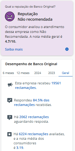 Banco Original no Reclame Aqui