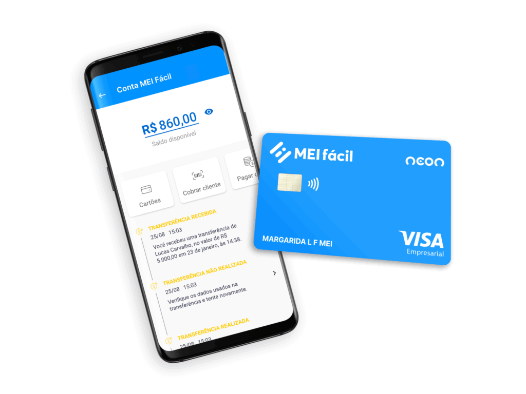 A MEI Fácil Neon é digital, gratuita e sem anuidade. Ou seja, você abre ela pelo app, de graça e não paga nada para ter a conta. Além disso, recebe um cartão múltiplo: débito e crédito. Dessa forma, você pode movimentar a sua conta como quiser.