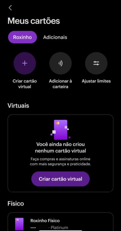 Assim que você clicar em “Meus cartões”, será direcionado para outra página, que mostra os cartões que você possui, sejam físicos ou virtuais.