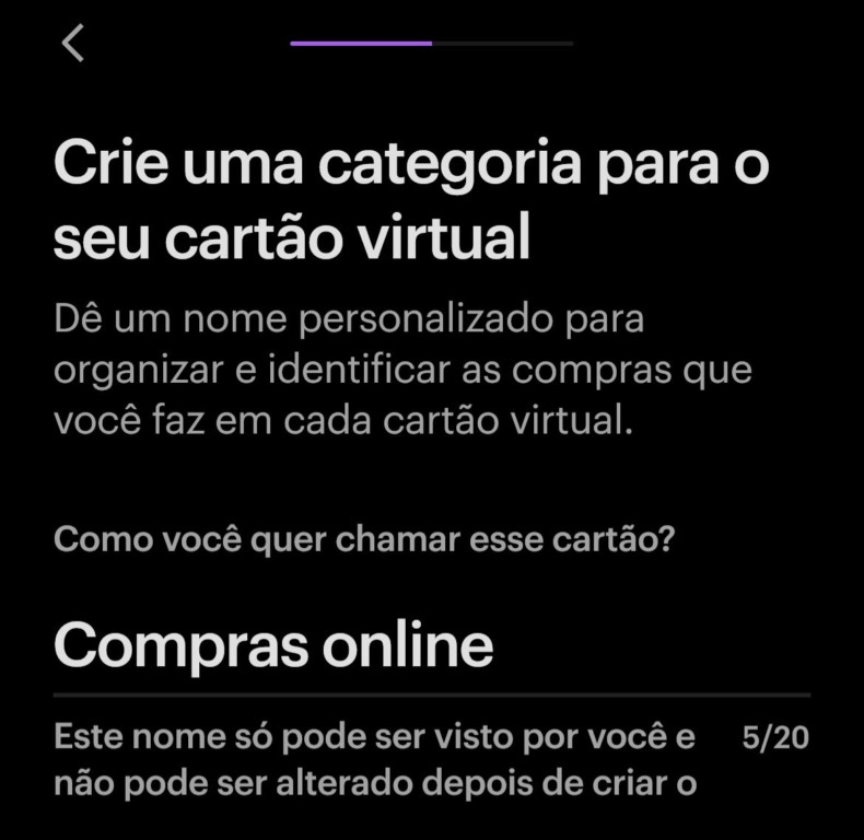 O próximo passo é você dar um nome ao seu cartão virtual. Isso serve para que você possa se organizar e tenha mais controle, principalmente caso possua mais de um cartão. Mas escolha bem, por que você não poderá mudar esse nome depois! Nesse exemplo, colocamos “Compras online” como nome.