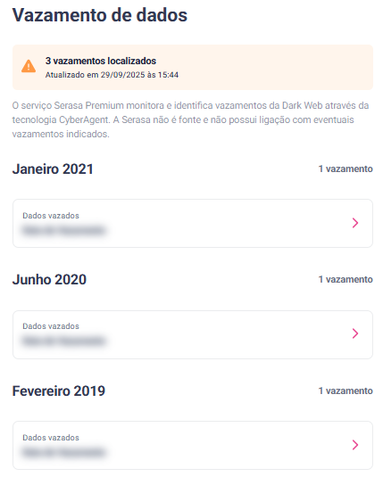Com a consulta de Score grátis do Serasa, conseguimos ver quantos vazamentos de dados você teve e quando ocorreu. No Premium, há informações mais detalhadas de quais seriam os dados, se foi na Dark Web e ainda receber uma consultoria.