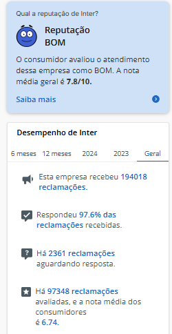 Em suma, o Inter apresentou uma nota 7,8/10 no geral, representando uma boa reputação. No curto prazo, por sua vez, a fintech também conta com a nota 7,9/10, tanto para os últimos 12 meses, quanto os últimos 6 meses, significando uma reputação boa para ambos os casos.