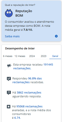 Como você pode observar, a nota da conta digital Inter no Reclame Aqui nos últimos meses é Ótima. Além disso, eles possuem quase 97% das perguntas respondidas e um índice de solução de quase 80%. Mesmo tendo muitas reclamações (cerca de 190 mil), com o alto índice de respostas e solução, os clientes ficam mais satisfeitos. Então, 70.2% dos clientes que reclamaram, voltariam a fazer negócios com o banco Inter.