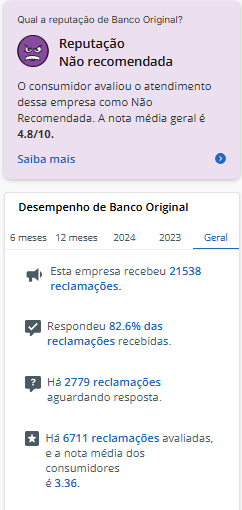 Buscando entender qual é a visão dos clientes do Banco Original, procuramos o perfil do banco digital no site Reclame Aqui.