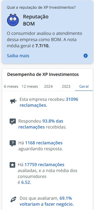 A princípio, a XP apresentou uma nota 7,7/10 no geral, representando uma reputação boa. No curto prazo, por sua vez, a corretora conta com a nota 7,9/10 para os últimos 6 meses, sendo também boa reputação para o período.