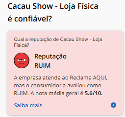 A Cacau Show também está no Reclame Aqui. Ela tem uma nota ruim, que é 5,6 de 10. Isso é com base nas opiniões das pessoas que compraram na Cacau Show e depois foram falar no Reclame Aqui.