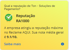 A Ton é uma empresa verificada no Reclame Aqui, possuindo o selo RA Verificada, que garante mais credibilidade e transparência nas interações com os consumidores.