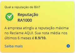 Em resumo, a empresa Bin possui uma boa credibilidade no mundo dos pagamentos online. Isso acontece, pois a organização dela tem bases sólidas, como um Banco confiável e uma empresa pioneira nas estruturas de pagamentos online, a FistData. Portanto, são funções de relevância para uma fIntech.