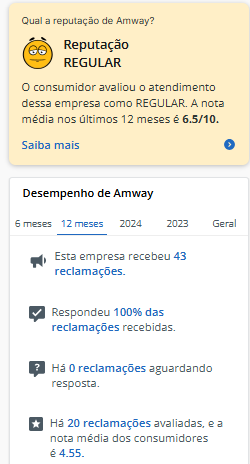 No entanto, é importante notar que a reputação da Amway no Reclame Aqui tem oscilado ao longo dos anos. Em 2025, a avaliação geral passou a ser regular, com uma média de 6.6. No período de 01/08/2024 a 31/07/2025, a média se mostra regular também, com nota 6.5.
