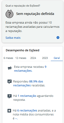 Nesse sentido, a ausência de uma nota se deve ao baixo número de reclamações na EqSeed, mesmo com o perfil existindo há mais de 7 anos. Portanto, o que se pode afirmar é que durante esse período não existem reclamações suficientes para a plataforma de equity crowdfunding.