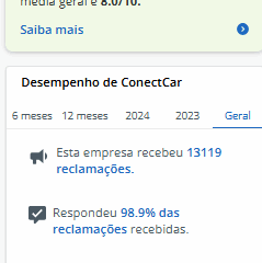 Em síntese, a ConectCar apresentou uma nota 8,0/10 no geral, representando uma ótima reputação. No curto prazo, por sua vez, a empresa conta com a nota 8,1/10 para os últimos 12 meses, apresentando uma reputação ótima, enquanto os últimos 6 meses apresentam uma nota 7,9/10, sendo uma reputação boa.