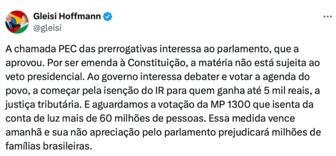 Após a aprovação, a ministra Gleisi Hoffmann reforçou que a PEC não é pauta do governo. Segundo ela, a prioridade do Executivo é avançar em medidas que impactam diretamente a população, como a isenção do IR para salários de até R$ 5 mil e a ampliação da tarifa social de energia elétrica.