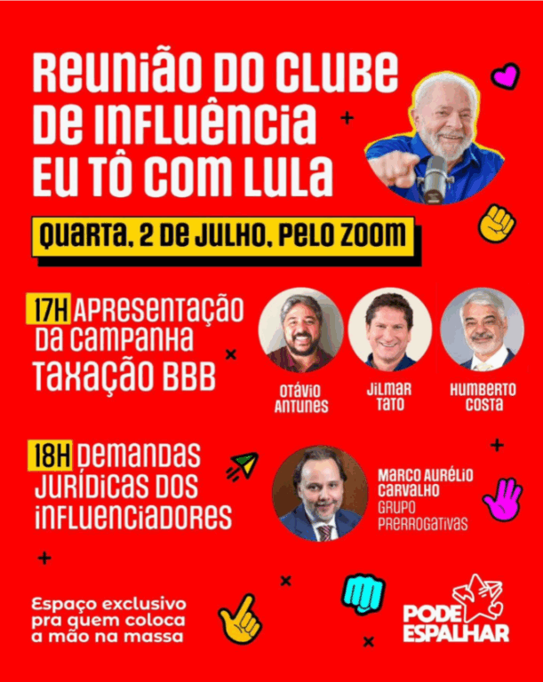 Em plena quarta-feira (2), às 17h, o PT vai reunir um time de influenciadores aliados para uma ofensiva virtual que promete agitar as redes. A pauta? Nada menos que a polêmica “taxação BBB” — bilionários, bancos e bets — bandeira que Lula tem empunhado para tentar salvar sua imagem e cumprir a promessa de isenção de IR para quem ganha até R$ 5 mil.