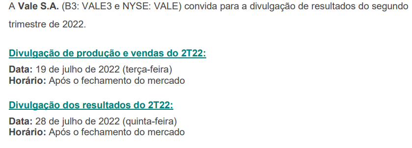 As divulgações do segundo trimestre deste ano (2T22) da Vale (VALE3) ocorrerão conforme calendário abaixo. Assim, apesentará produção e vendas, bem como os resultados do trimestre.